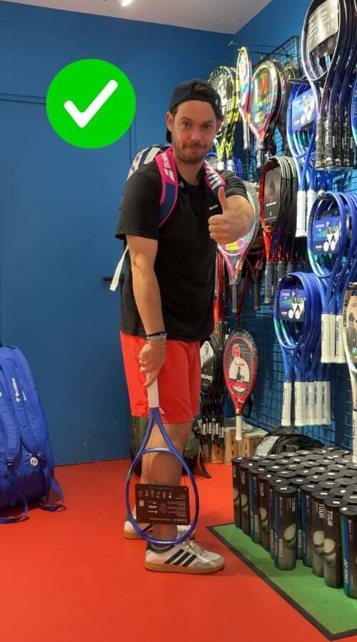 Le repère est que la tête de raquette de tennis arrive au niveau de la malléole (l'os de la cheville). Si la tête de raquette arrive au-dessus, la raquette est trop petite, si la raquette touche le sol, elle est trop grande.